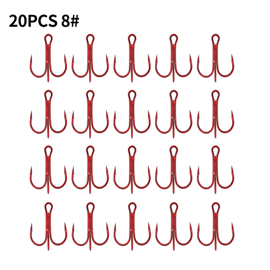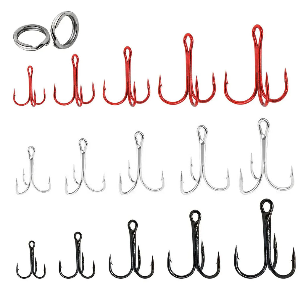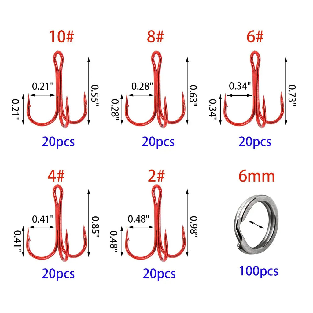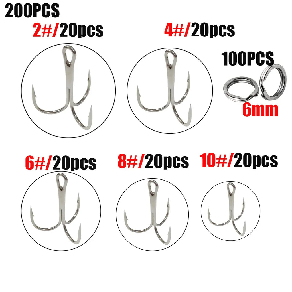 Este kit inclui 200 anzóis triplos afiados em aço carbono de alta resistência e 100 argolas de aço inoxidável.