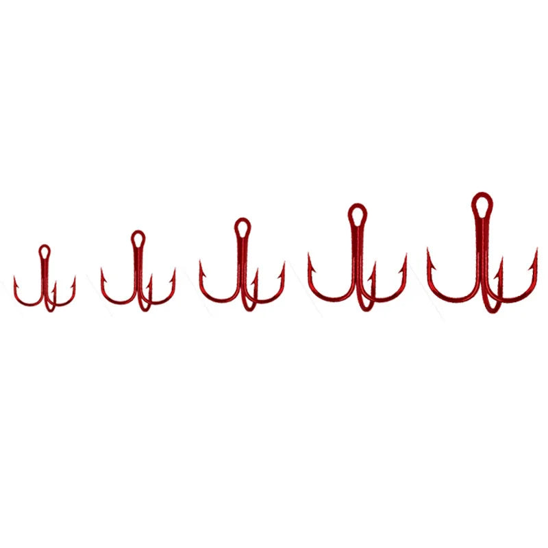 Este kit inclui 50 anzóis triplos com tratamento anticorrosivo em níquel vermelho, fabricados em aço de alto carbono para máxima resistência.