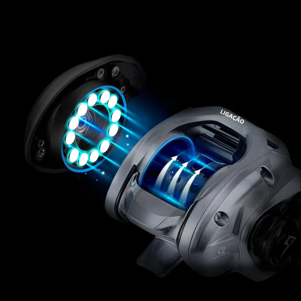 Projetado para pesca em água doce e salgada, possui um sistema de fricção magnética com 12 ímãs e capacidade de arrasto de até 10 kg.