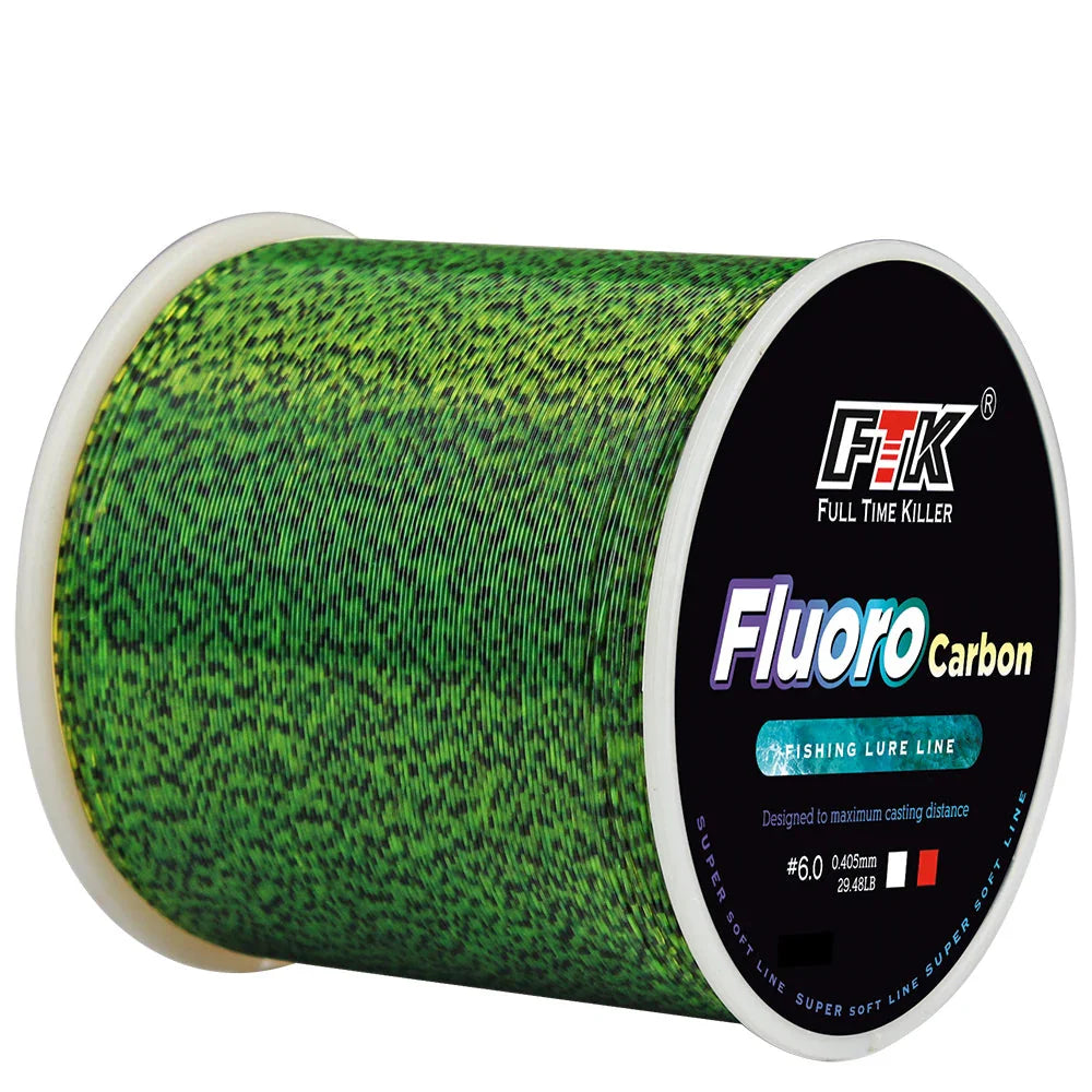 Linha de pesca FTK revestida com fluorocarbono, disponível em comprimentos de 300m e 500m.