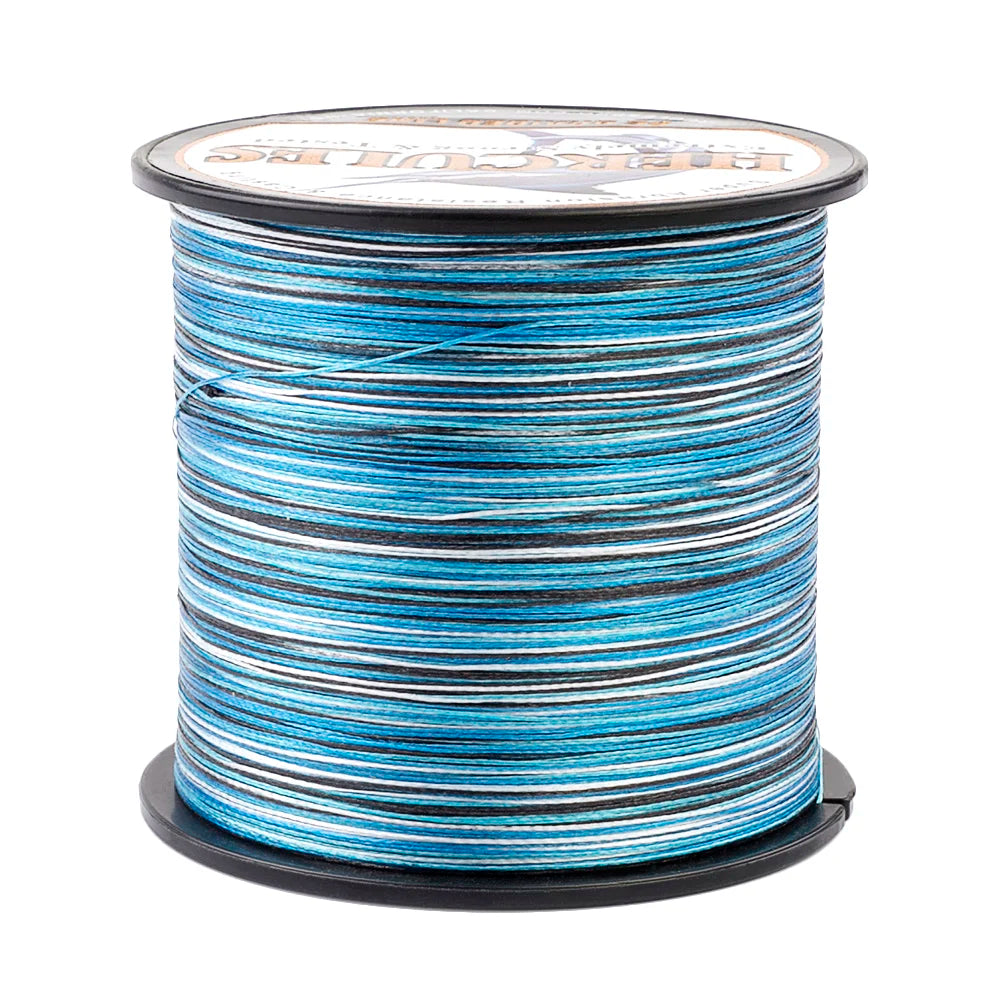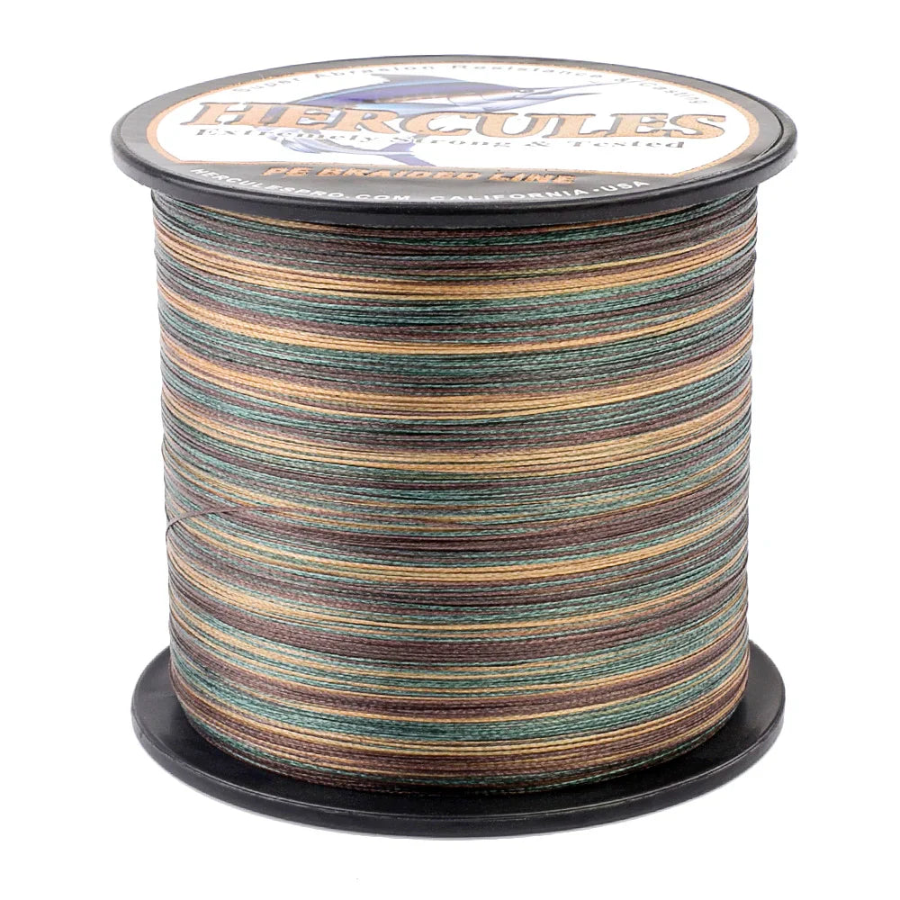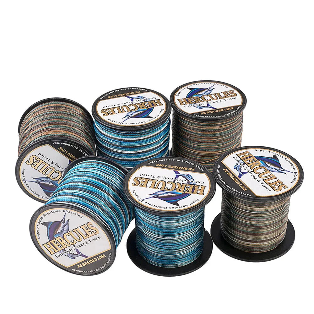 Linha de pesca Hercules de 4 fios com estampa camuflada azul ou verde, feita de fibra PE de alta resistência.