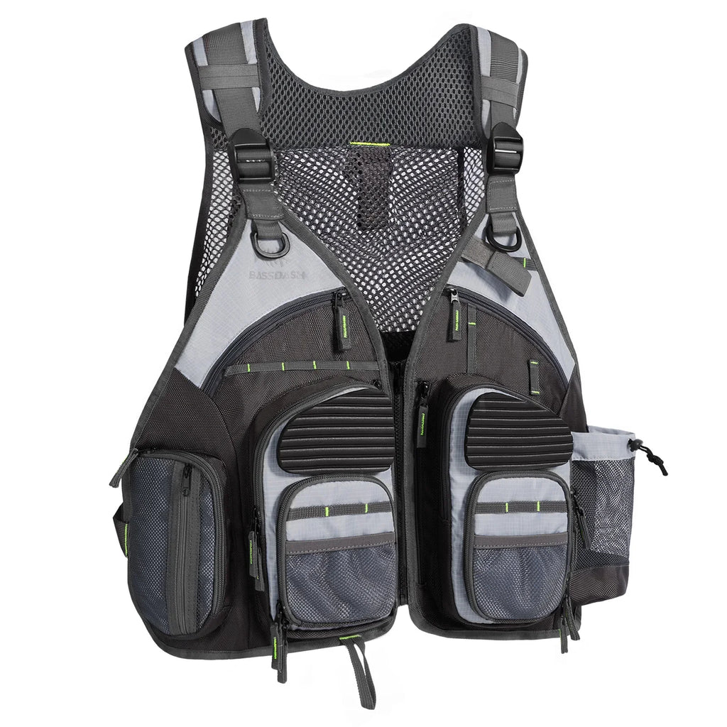 Colete de pesca profissional com 20 bolsos, incluindo compartimentos com zíper e área para hidratação.