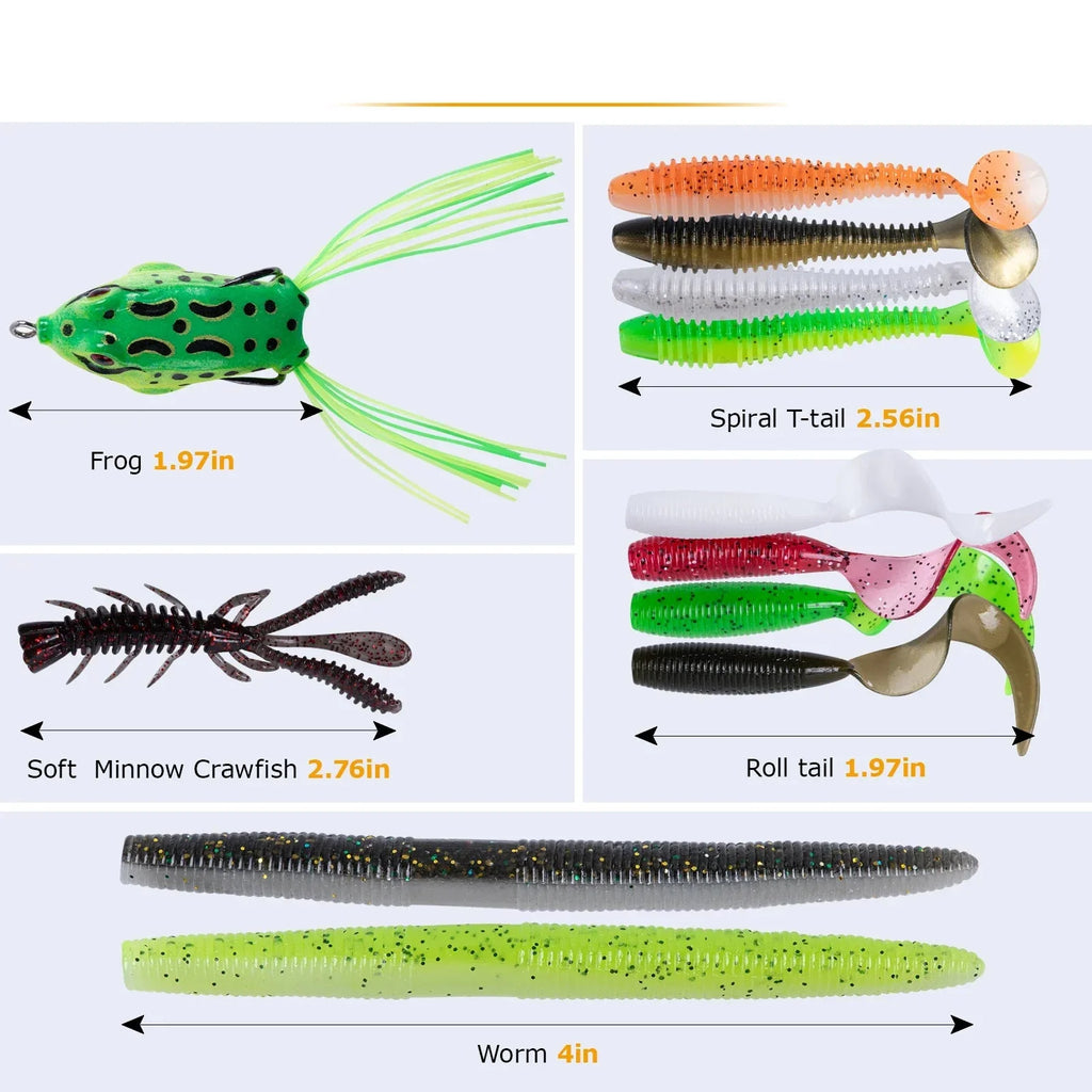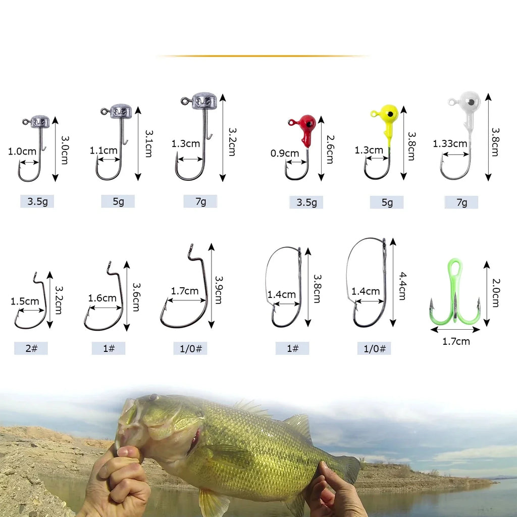 - Conteúdo: 450 peças (iscas macias, rígidas, jigs, colheres)
