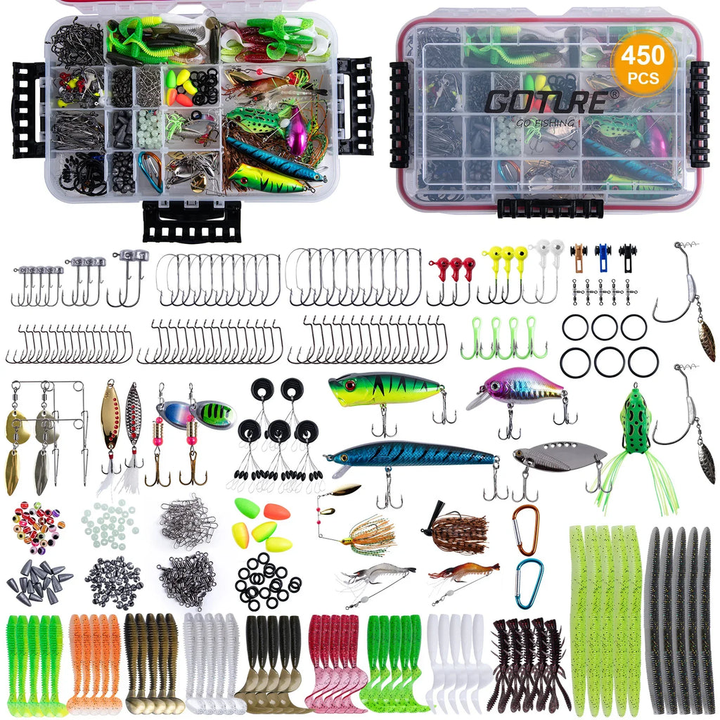 Este kit completo da Goture inclui 450 peças de iscas artificiais, rígidas e macias, além de anzóis, ideal para pesca em rios, mar, lagos ou córregos.
