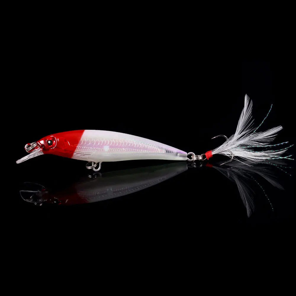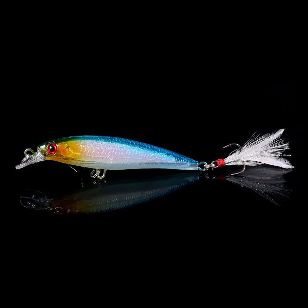 Isca artificial rígida tipo minnow de 9 cm e 8 g com design cortado a laser, olhos 3D, anzol com penas e esferas internas de aço inoxidável para equilíbrio e longo alcance de arremesso.